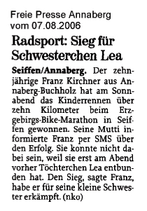 Die Presse titelt „Radsportler wühlen sich durch den Matsch“, es finden erstmals Kinderrennen statt, Thomas und Claudia sind würdige Champions. In Erinnerung bleibt der extra im Ziel aufgestellte beheizte Bade-Bottich, in dem die Sieger ein Entspannungsbad nahmen.