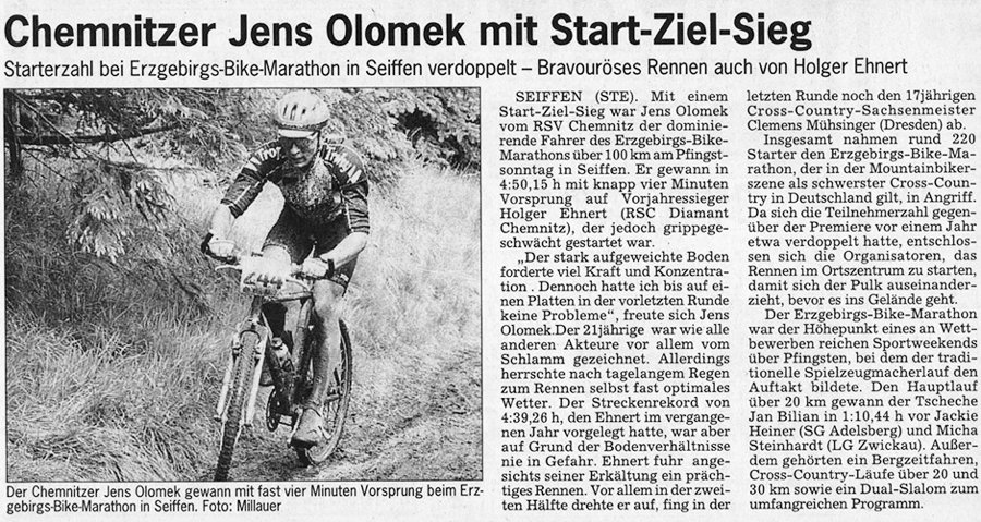 Hill-Climb, Marathon und Dual-Slalom sollten es schon sein. Auf tiefem Geläuf gewinnt Jens Olomek aus Chemnitz vor dem Vorjahressieger Holger Ehnert und dem damals 17jährigen Cross-Country-Sachsenmeister Clemens Mühsinger aus Dresden. Auch Clemens wird x-mal beim EBM am Start sein. Zum Dual-Slalom am Schwartenberg tritt “Nutella-Mann” Nils Peter Jensen an, wurde aber seinerzeit von einem Local bezwungen. In Erinnerung bleibt der Blitzeinschlag “aus heiterem Himmel” auf dem Schwartenberg, bei dem glücklicherweise niemand zu Schaden kam.